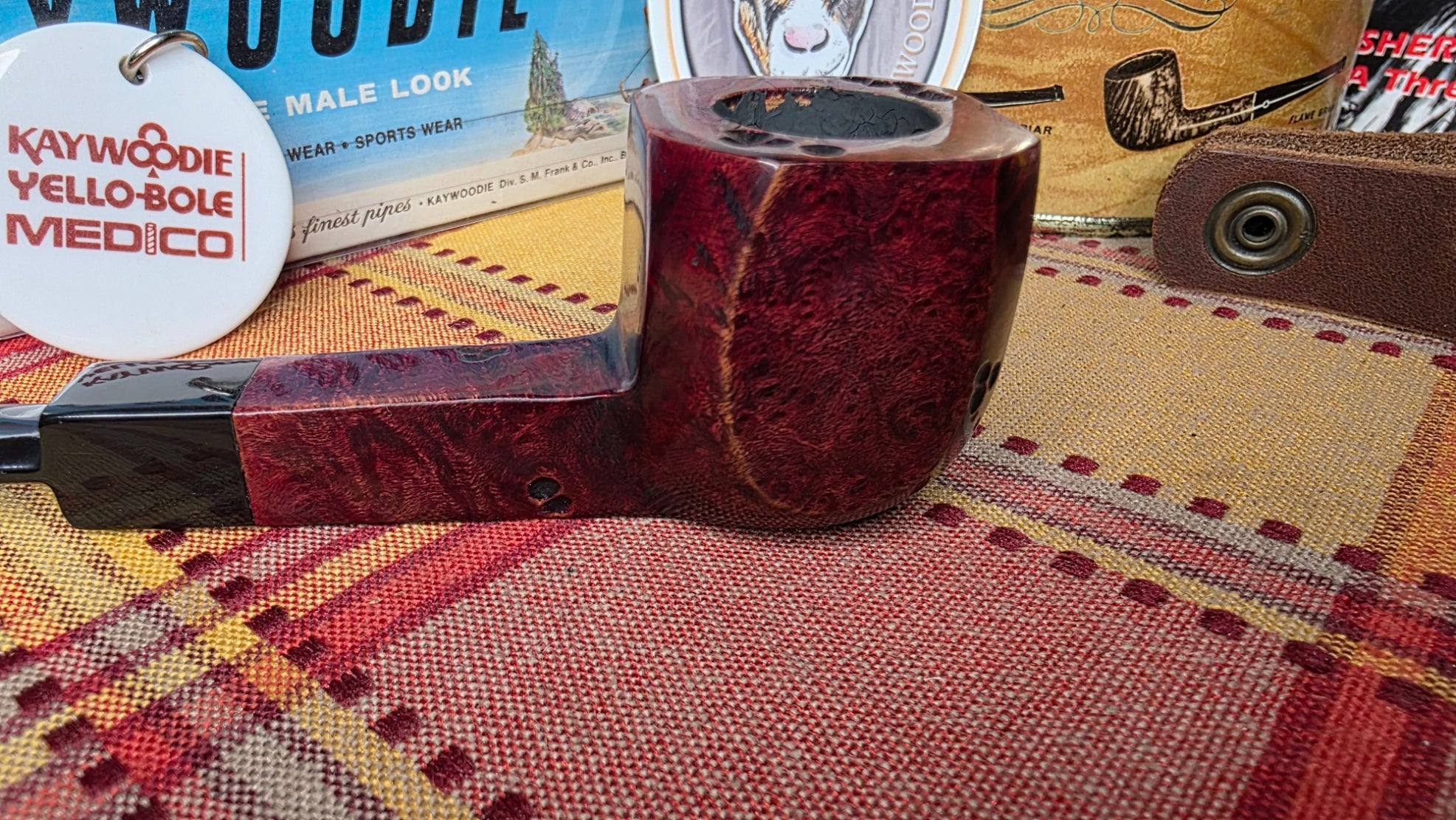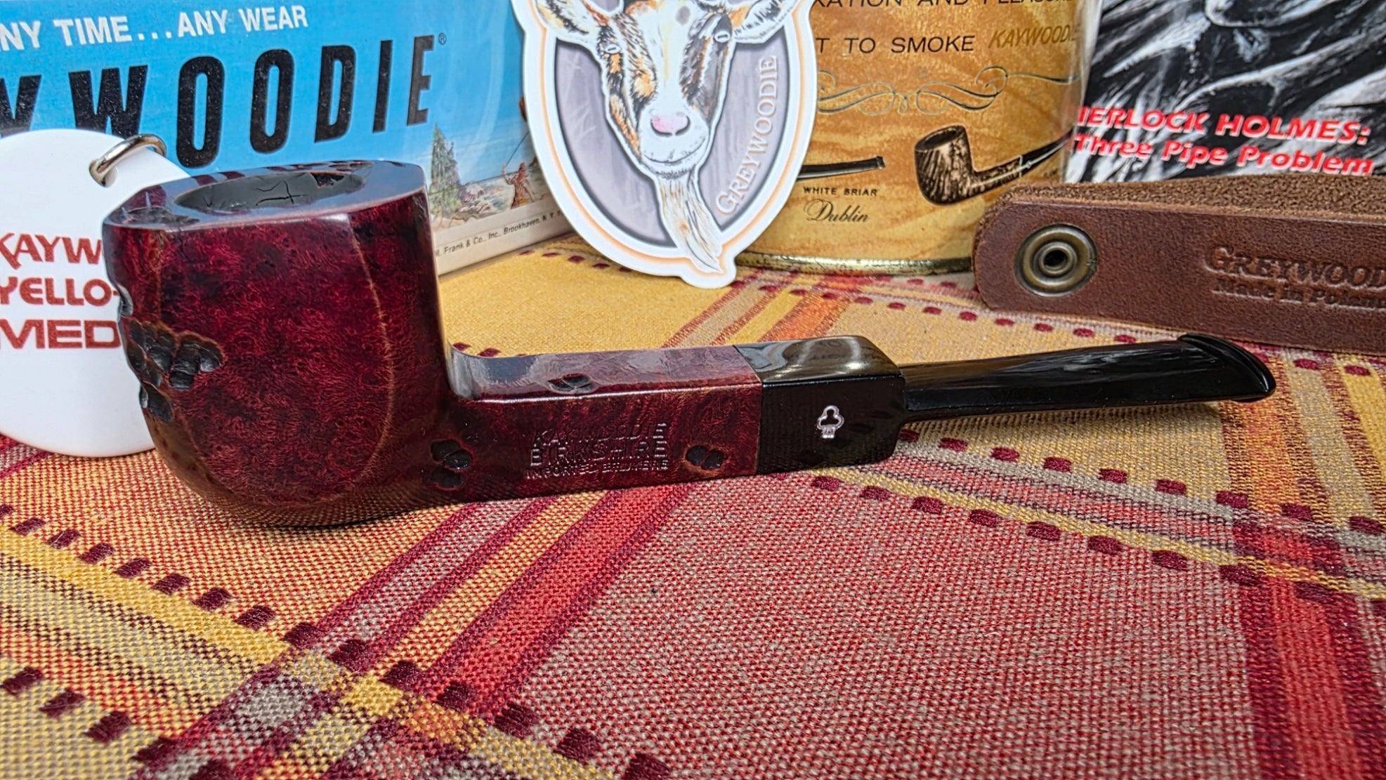 Kaywoodie Birkshire Panel pipe with straight saddle bit stem. Silver Clover logo. Stained a plum color and partially rusticated. 5.5 inches long and 1.5 inches tall. 1.31 ounces.