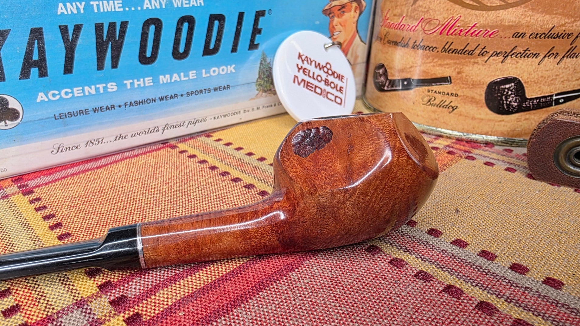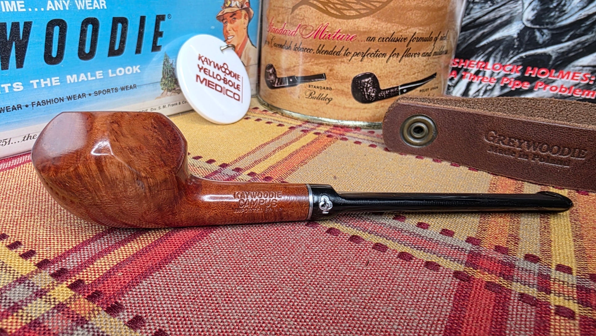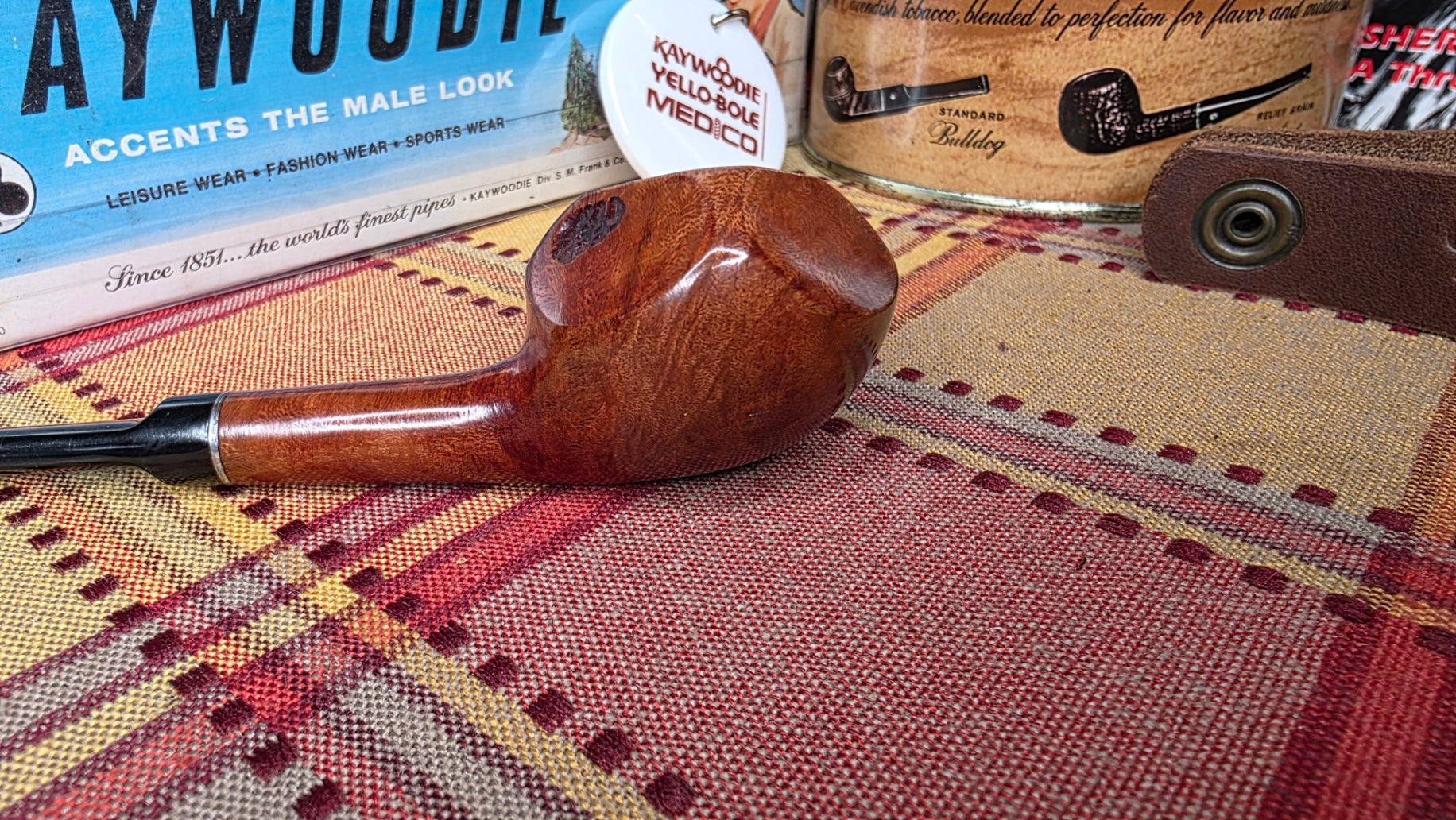 Kaywoodie Campus pipe in a unique shape with four panels on the top half, with straight, screw in vulcanite saddle stem and small stinger, silver Clover logo on stem. Small pocket pipe with small bowl in a fun shape and stained brown. Nice grain, partially rusticated. Good for short smokes. 5.85 inches long and 1.25 inch tall. 0.71 ounces.
